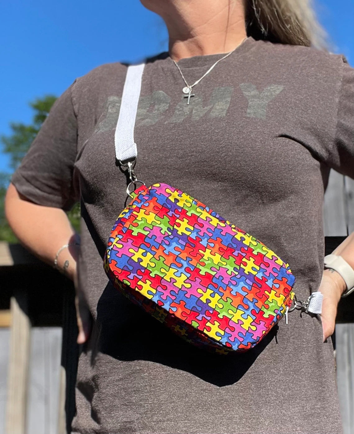 Show your support for Autism Awareness wherever you go with this crossbody bag. Handmade, this belt bag/crossbody bag comes in two sizes- regular and Mini.